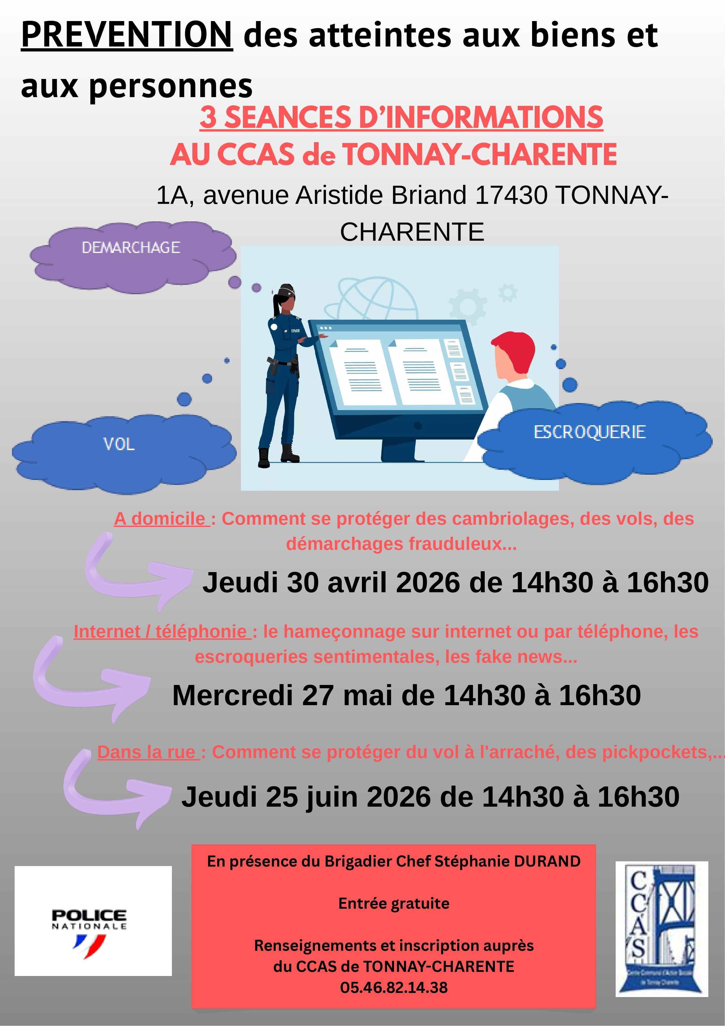 Le Centre Communal d’Action Sociale (CCAS) de Tonnay-Charente, en partenariat avec la Police Nationale et en présence de Stéphanie DURAND, Brigadier-Chef, organise trois ateliers gratuits à destination des seniors, consacrés à la prévention des arnaques, des vols et à l’adoption des bons réflexes du quotidien.