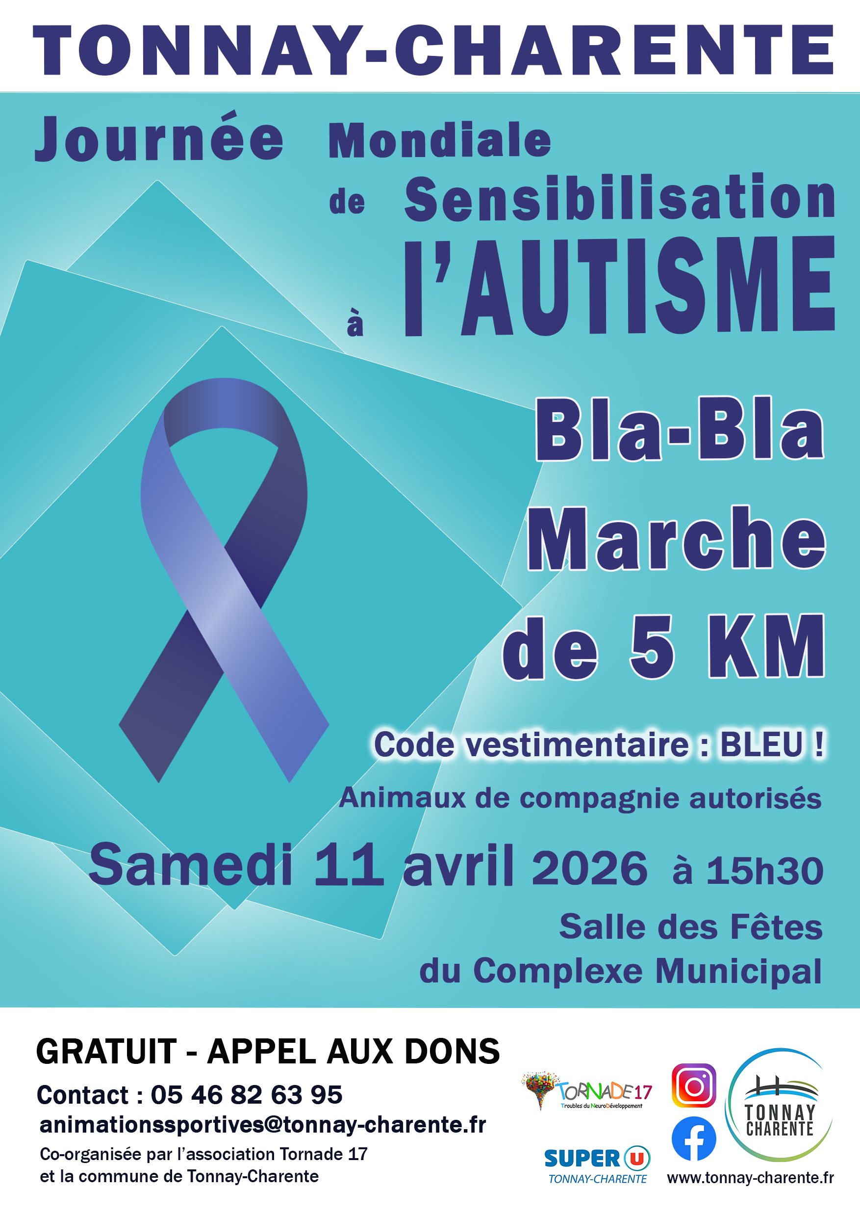 Dans le cadre de la Journée mondiale de sensibilisation à l’autisme, célébrée le 2 avril, la Ville de Tonnay-Charente et l’association Tornade 17 organisent une marche solidaire de 5 km, ouverte à tous, le samedi 11 avril 2026.