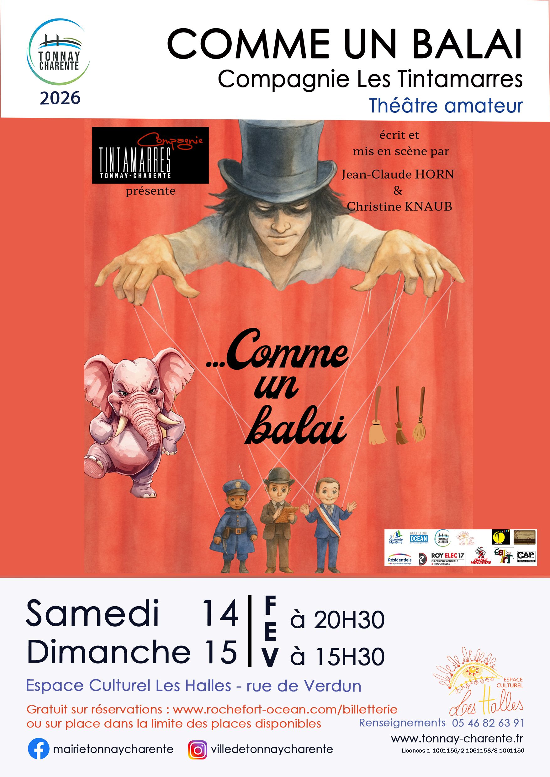 Affiche Comme un Balai FINALECréation 2026 de la compagnie de théâtre amateur Les Tintamarres de Tonnay-Charente.