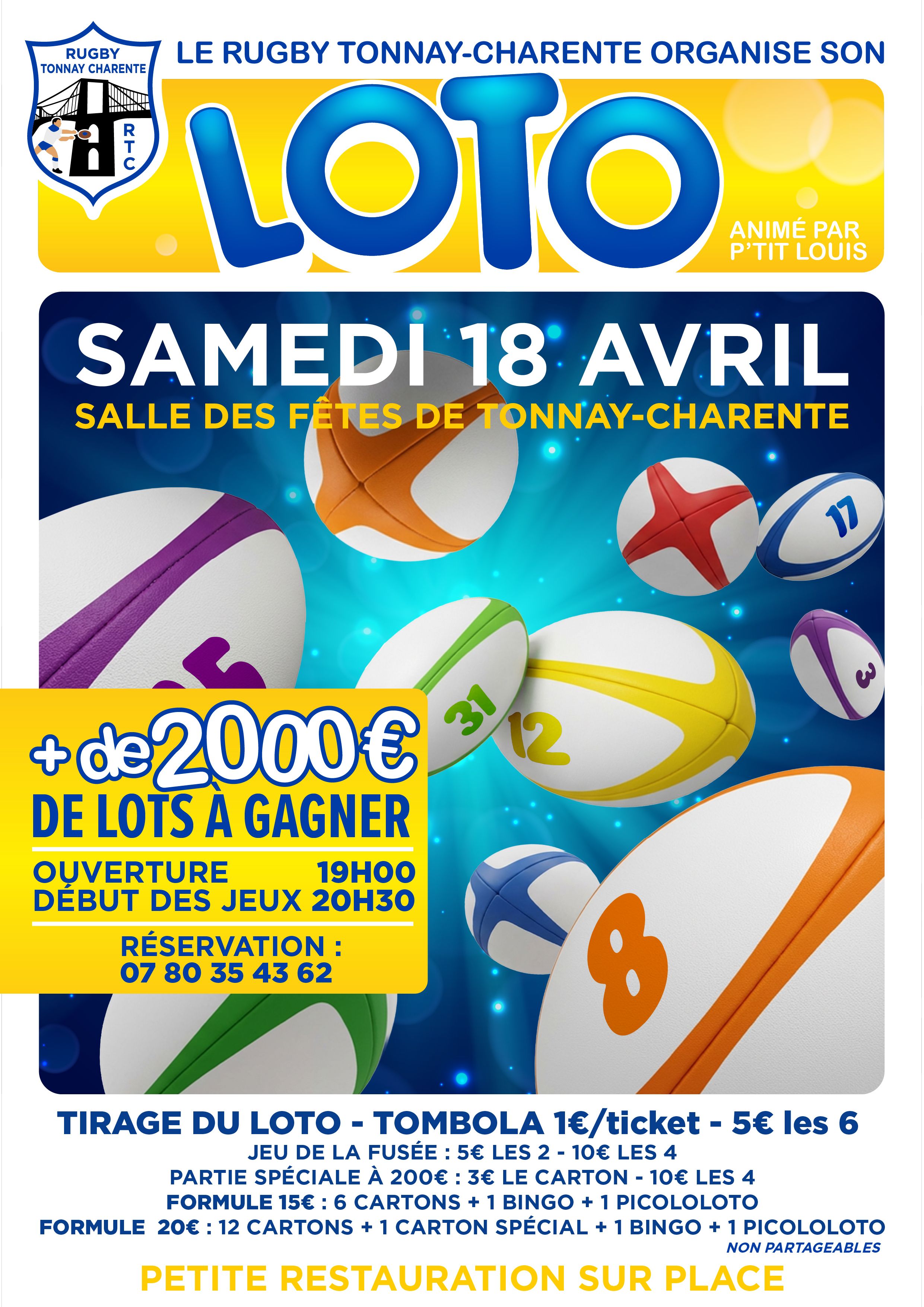Le Rugby Tonnay-Charente organise un loto le samedi 18 avril à 20h30. Ouverture des portes à partir de 19h. Réservation au 07 80 35 43 62.